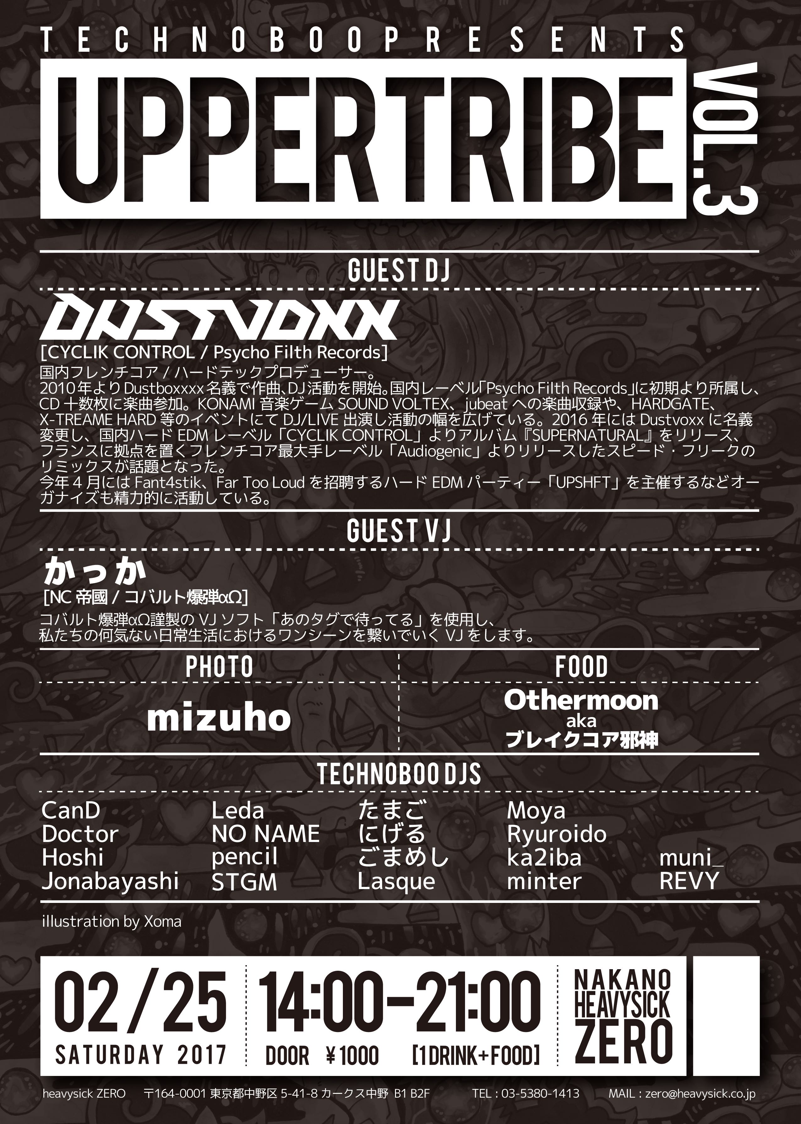 2017年2月25日開催 Technoboo様主催 『uppertibe vol.3』のフライヤーデザインを担当しました。イラストはXoma(@Xoma18)氏です。