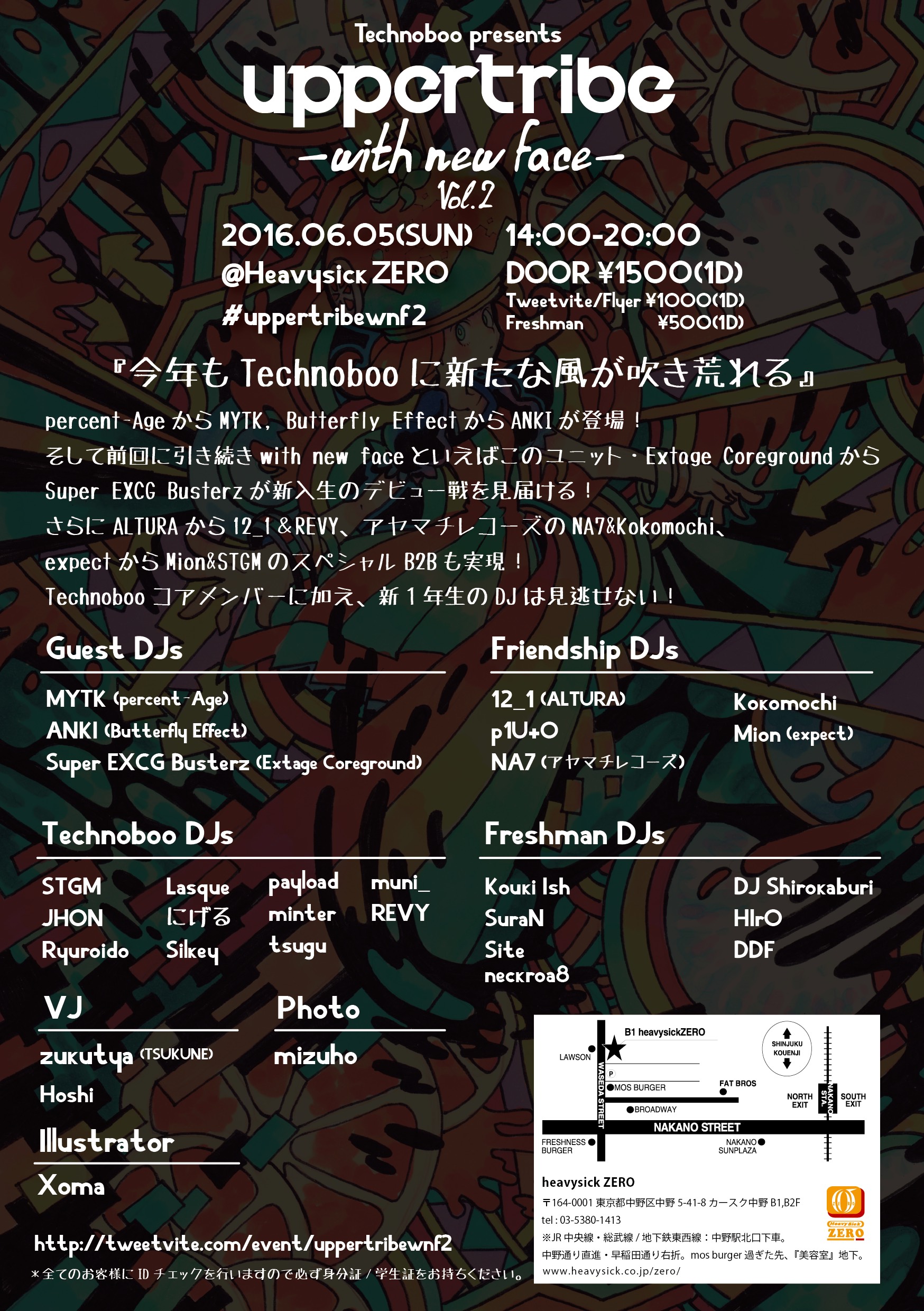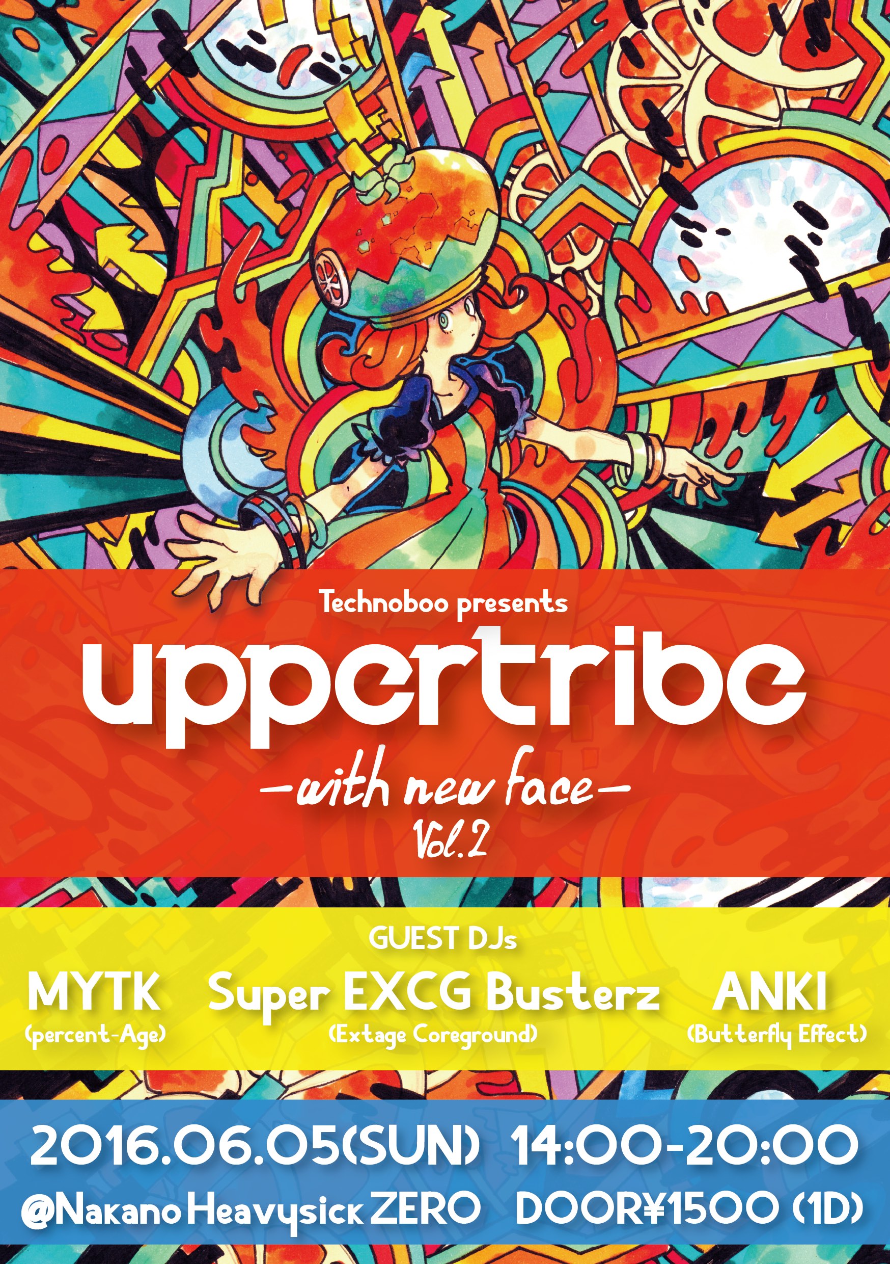 2016.05.17 05:24 #Image #Design uppertibe -with new face- vol.2 2016年6月5日開催 Technoboo様主催 『uppertibe -with new face- vol.2』のフライヤーデザインを担当しました。イラストはXoma(@Xoma18)氏です。 Back